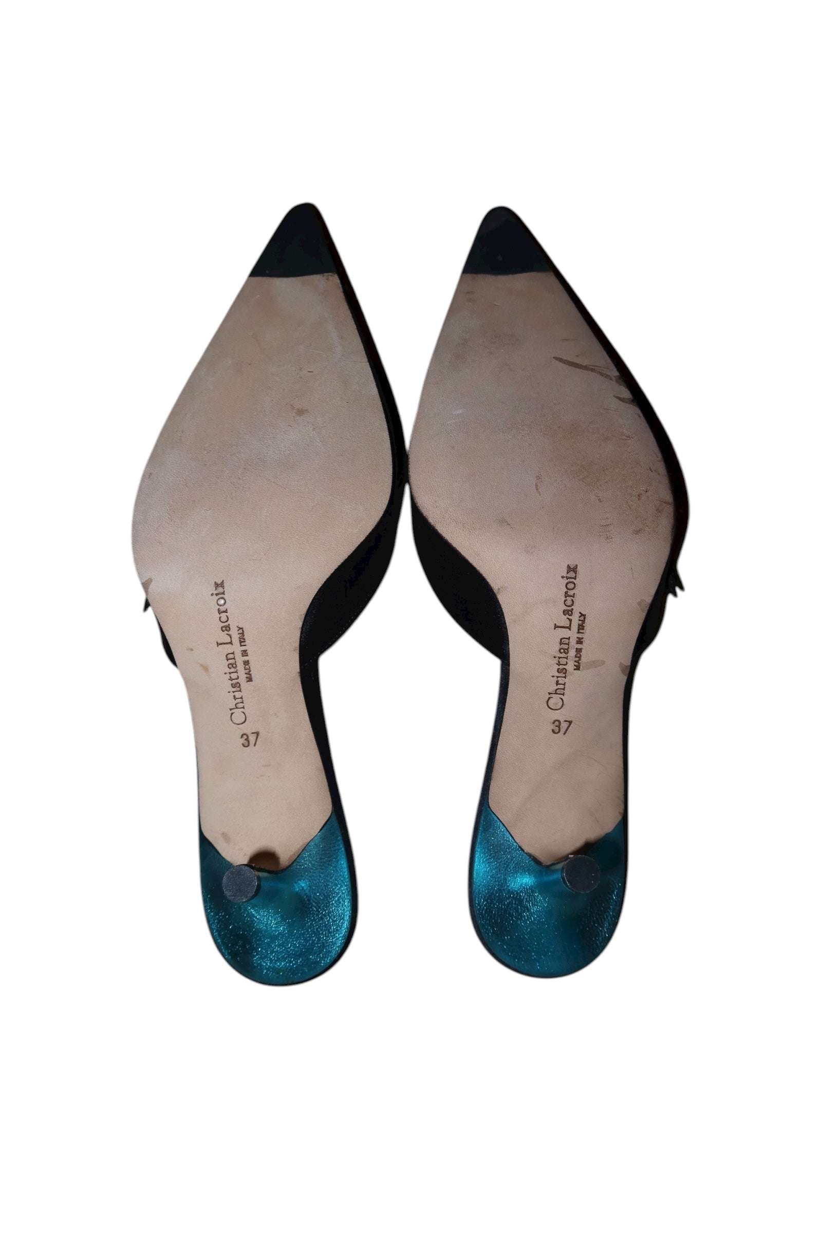 Christian Lacroix black satin heels with bow and blue rhinestone (37)